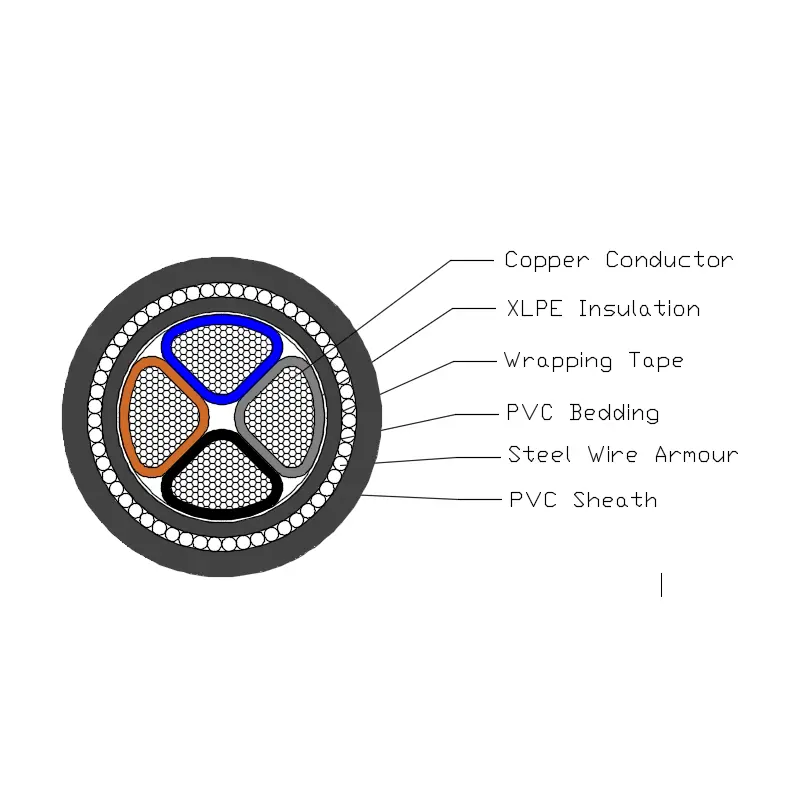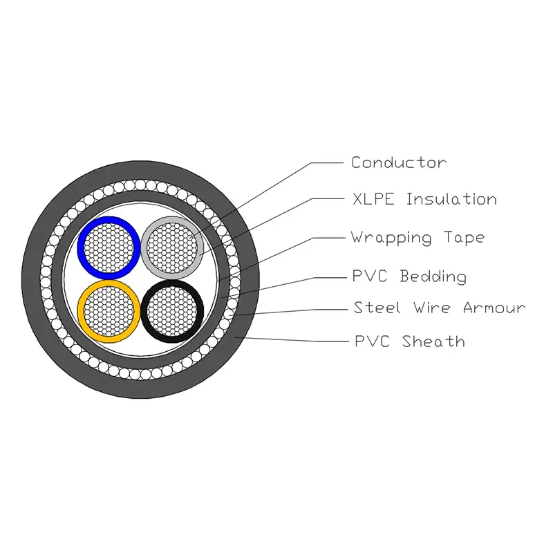 XLPE इन्सुलेटेड PVC Sheathed SWA पॉवर केबल T1R कॉपर कंडक्टर, XLPE इन्सुलेशन, PVC बेडिंग, स्टील-वेअर्स आर्मर आणि PVC शीथ यांनी बनलेली आहे.
